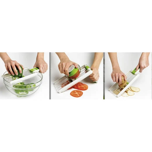 The Collapsible Handheld Mandoline is the perfect tool for slicing your favorite fruits or vegetables thin and delicious. Quickly and easily slice up any fruit for a cocktail garnish or slice up veggies for dinner. With a handle that rotates into 3 different positions (underneath, 90°, straight out) and a collapsible finger guard this gadget can not only be used in many different instances but it folds flat for minimal storage. This mandoline has two safety settings and four thickness setting that are easy to change by just turning the dial.