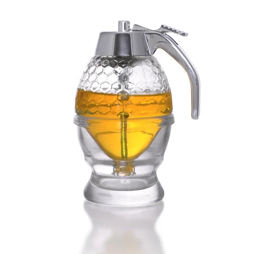 This glass handcrafted non drip honey dispenser is the best way to store and dispense honey, syrup, condensed milk, and many more substances. Everybody loves the well known honey bear squeeze bottles, but this non drip syrup dispenser is a more sophisticated alternative. Traditional syrup bottles and honey dispensers drip and spill, making the bottle sticky and creating an all around mess. This honey dispenser pours out from the bottom instead of the top and has a non drip function that prevents the spout from getting gummed up with excess honey. The glass features an attractive honeycomb design that makes it the perfect eye-catching addition to any home, restaurant, bar or diner. The clear glass of this non drip syrup dispenser allows you to enjoy not just the sweet taste of its contents, but also the rich coloring. You can even fill the glass base with warm water to keep the honey soft and warm. This products works great at dispensing the perfect amount of sweetness into your favorite honey infused cocktails like the Beeâs Knees, Brown Derby and Gold Rush. This non drip honey dispenser is a beautiful and unique piece that is a must have for any restaurant or home bar.