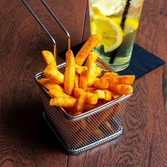 These wire serving baskets are a unique way to serve appetizers and entrees. They are made of a very durable steel mesh wire and feature a handle for easy serving. This product comes in two different sizes. A small square basket and a medium sized rectangular basket. These baskets are ideal for a wide variety of food options such as fries, chips, popcorn shrimp, and so much more. This product is dishwasher safe.